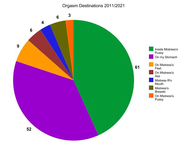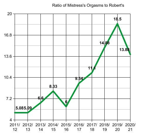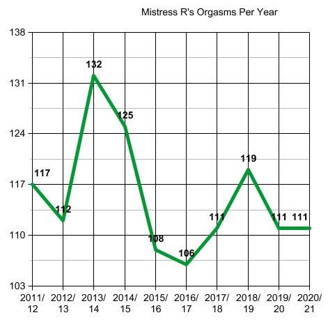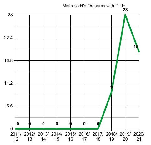 This chart shows the number of orgasms Mistress had on my tongue, but assisted by her glass dildo. A bit of a fall after a very steep rise last year.