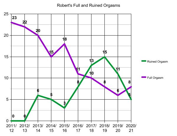 Quite dramatic, but then you have to take into account the total number of orgasms that I have been allowed… so even two this year still represents 25% of the total number of eight.