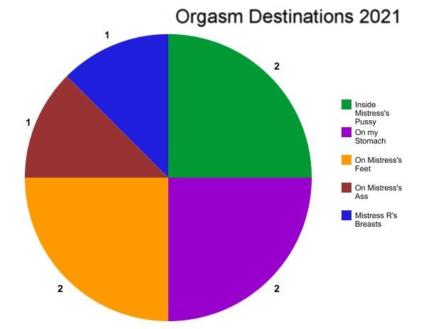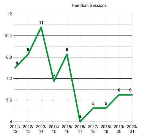 Next up we have our number of Femdom sessions, which again is a solid six, the exact same number as last year. Again, at least we are not slipping backwards, and considering we didn’t have our first session of this Chastity Year until August 2020, that means we’ve only missed out two since then.