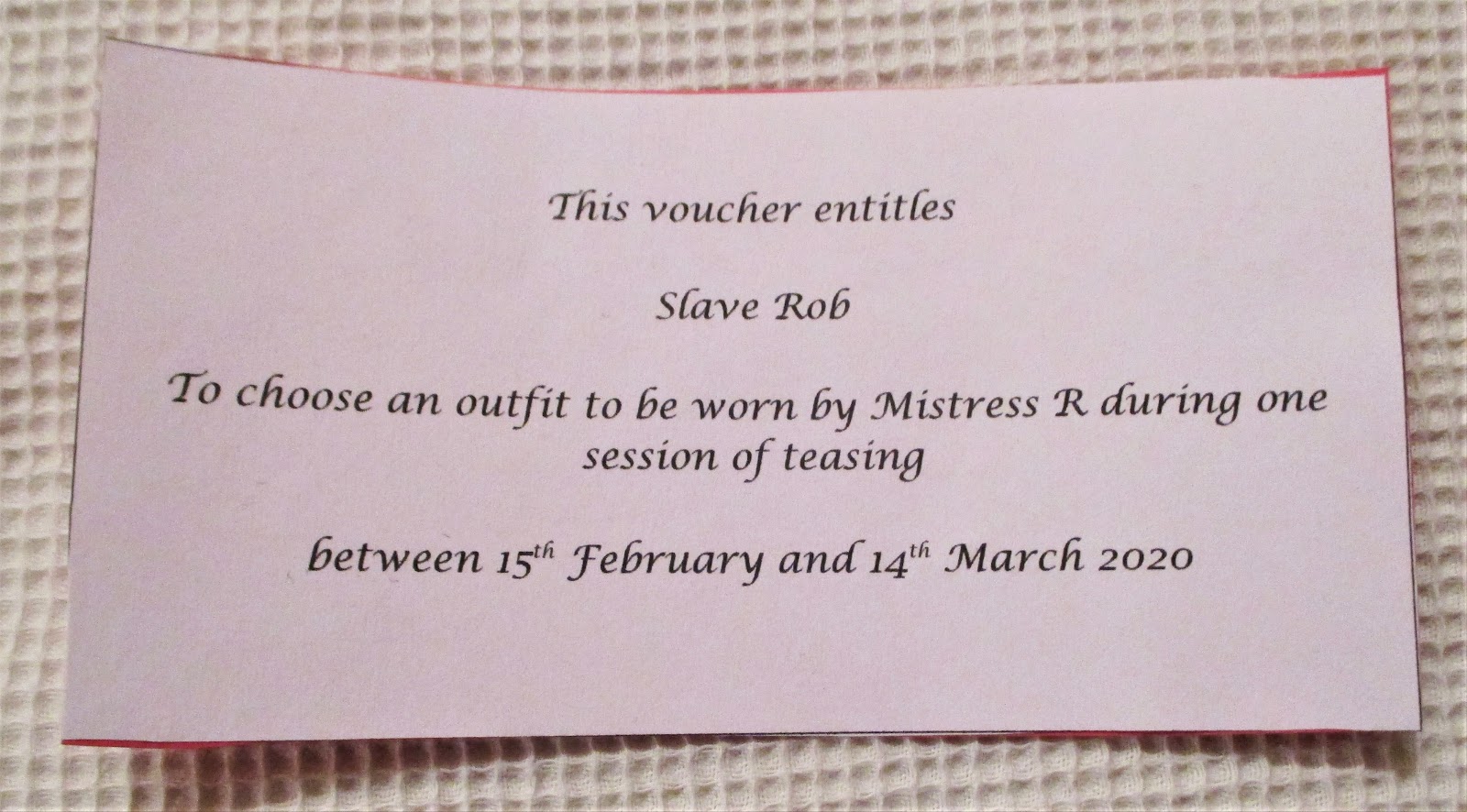 This was Mistress and I’s 28th Valentine’s Day together, and it went pretty well – we had a lovely meal at home and exchanged some gifts which included some cool vouchers for me: